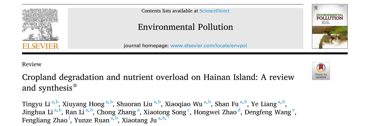 9月8日,环境科学类TOP期刊《Environmental Pollution》以WilliamHill体育三亚南繁研究院为第一单位,热带耕地养分资源循环利用与质量保育团队李婷玉副研究员为第一作者,发表了题为“Cropland degradation and nutrient overload on Hainan Island: A review and synthesis”《海南岛农田退化与养分过量投入:综述与综合》的综述论文。