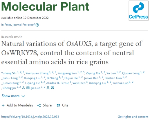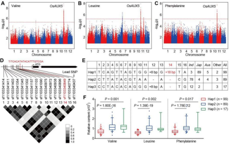 近日,入驻WilliamHill体育三亚南繁研究院的罗杰教授团队在Molecular Plant (IF=21.9)上在线发表题为“Natural variations of OsAUX5, a target gene of OsWRKY78, control the contents of neutral essential amino acids in rice grains” 的研究论文。该研究利用全基因组关联分析(GWAS)鉴定到控制水稻籽粒多种EAA积累的关键基因OsAUX5,为水稻营养品质改良提供了重要基因资源。