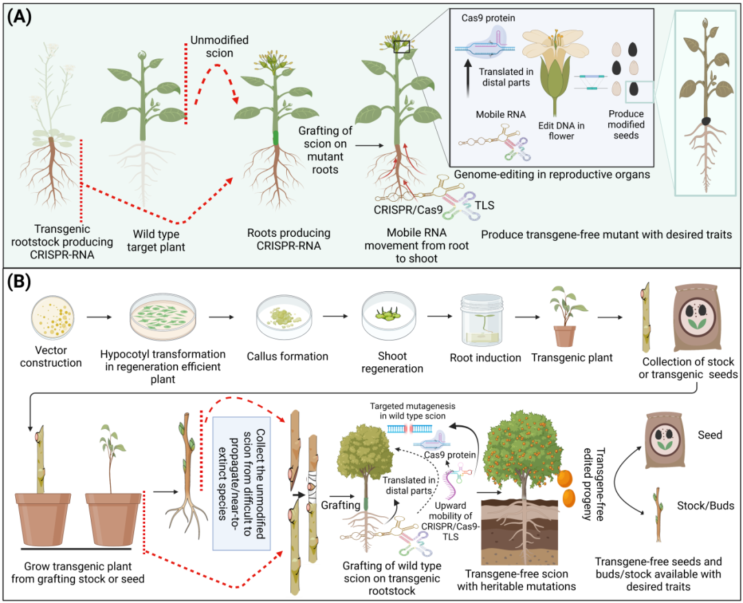 CRISPR/Cas9基因技术以RNA的形式从转基因根运输到未修饰的嫁接接穗的远端部分,并被翻译成蛋白质,以在所需位点诱导可遗传的突变。这项技术有可能在难以繁殖和濒临灭绝的物种中产生无转基因和遗传稳定的植物。