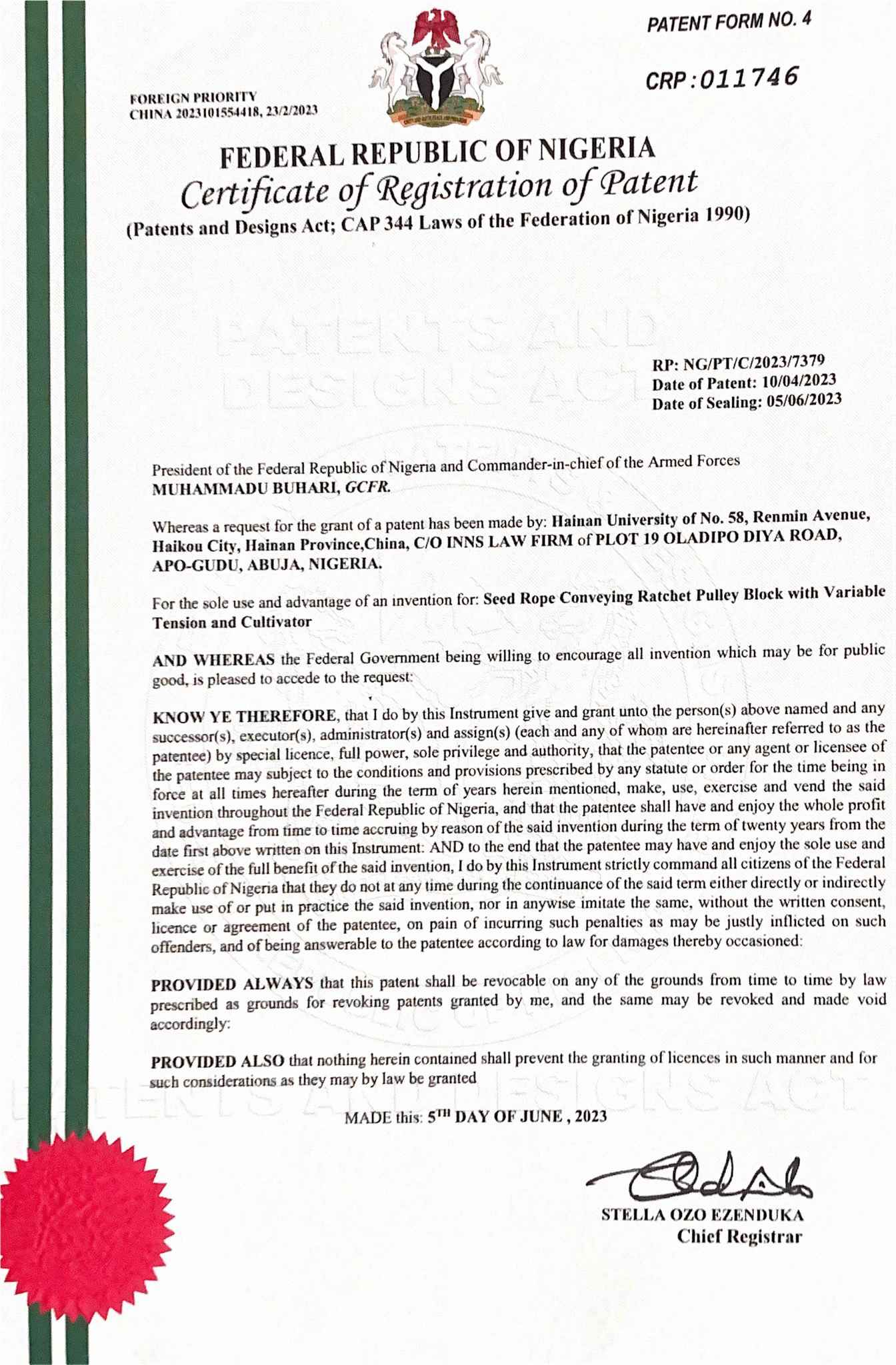 图11. “Cultivator and Method for Controlling Automatic Sowing”国际发明专利授权证书
