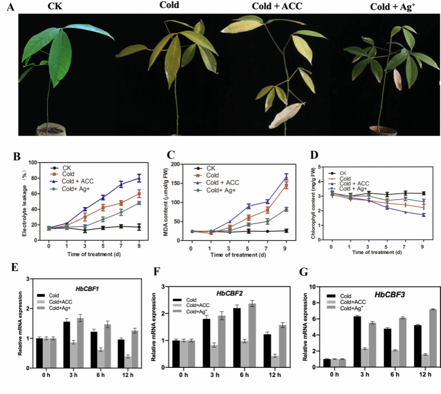 图9. 乙烯能够负调控橡胶树低温耐受性