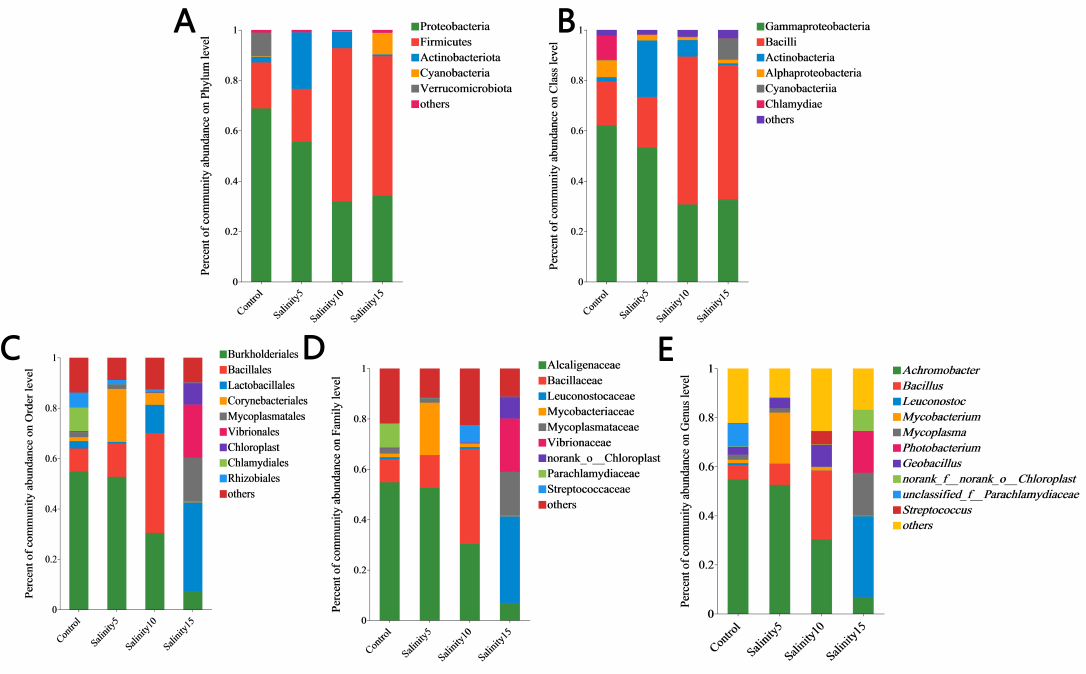 图3. Relative abundances of the dominant bacteria at the (A) phylum level, (B) class level, (C) order level, (D) family level, and (E) genus level in the intestines of M. salmoides in environments varying in salinity