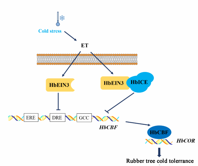 寒害是我国植胶区的主要自然灾害之一,不仅影响橡胶产量还威胁橡胶树的生存,成为限制我国植胶业发展的瓶颈,但目前对橡胶树抗寒分子机理的研究仍处于起步阶段。乙烯,作为调控橡胶树产排胶的重要激素,是否调控橡胶树耐寒性能仍不清楚。该研究团队首次发现乙烯能够负调控橡胶树耐寒性能(图9),并系统阐明其作用机理。一方面,乙烯信号核心转录因子HbEIN3通过与冷应答基因HbCBF1的启动子直接结合,抑制HbCBF1的表达负调控橡胶树耐寒性能;另一方面HbEIN3通过与HbICE2相互作用,抑制HbICE2的转录活性降低HbCBF1的表达从而降低橡胶树耐受低温的能力。该发现将为橡胶树抗寒分子育种提供重要的基因资源,为新型抗寒剂研发提供理论和技术支撑。