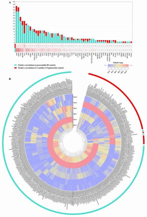 图8. 基于WGCNA筛选到的与原花青素和花青苷生物合成相关的转录因子数量(上);