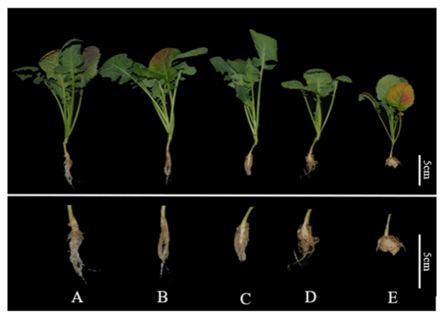 注:(A):未接菌处理的616A表型;(B-E)接种根肿菌4号生理小种后的表型。B,616ACRb;C,616APbBa8.1+CRb;D,616APbBa8.1;E,616A。