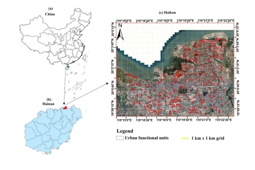 图1. 海口的地理位置;(a)中国和海南的方位图,(b)海南和海口市,(c)海口市卫星地图(https://www.google.com/maps)显示本研究调查城市功能单元(UFUs,红色边界)