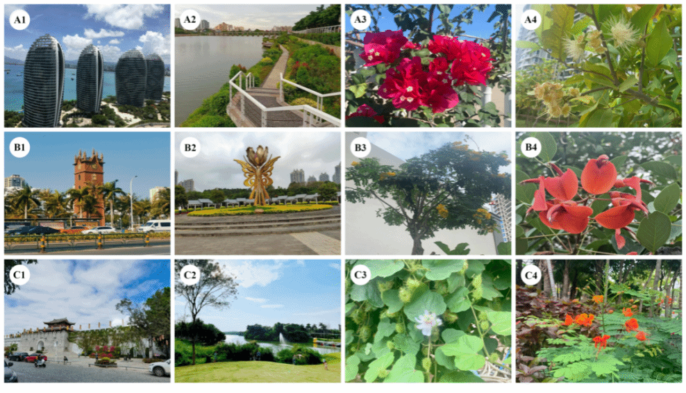 注:(A1)三亚凤凰岛酒店; (A2)崖州水南村; (B1)海口钟楼; (B2)湛江南国热带公园; (C1)崖州古城; (C2)儋州花果山公园。常见或特色的代表植物:(A3)三角梅Bougainvillea spectabilis; (A4)洋蒲桃Syzygium samarangense; (B3)黄槐决明Senna surattensis; (B4)鸡冠刺桐Erythrina crista-galli; (C3)龙珠果Passiflora foetida; (C4)洋金凤Caesalpinia pulcherrima