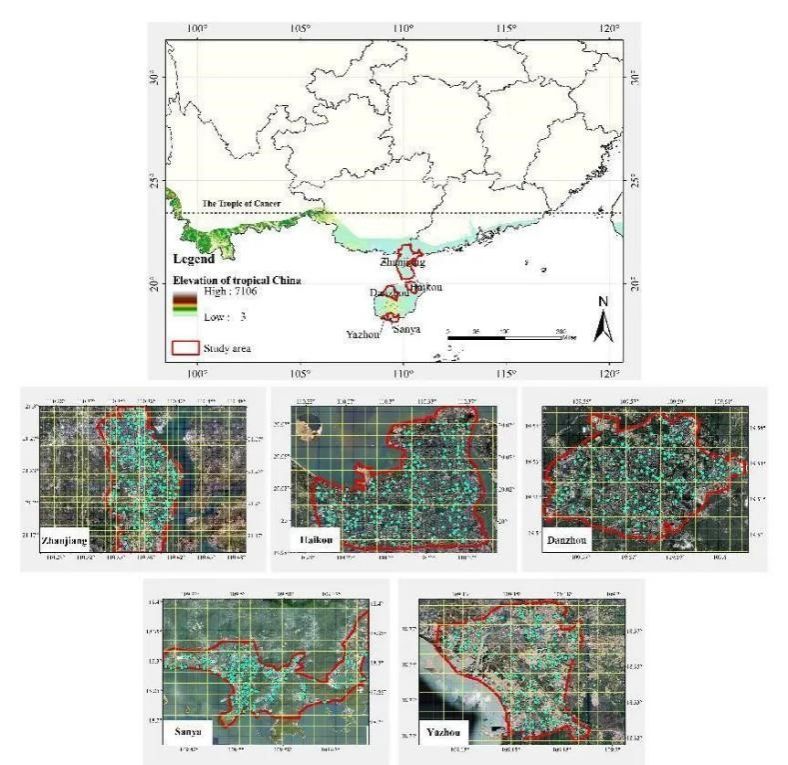 图1. 中国热带地区五个城市的区位以及采样点分布
