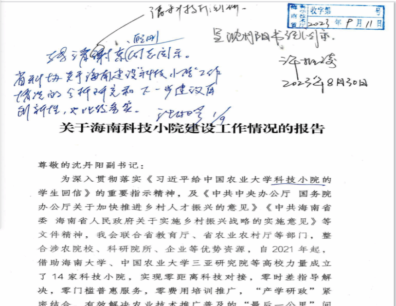 2023年9月11日,由热带耕地养分循环利用与质量保育团队负责人提交到省科协的《关于海南省科技小院建设工作情况的报告》得到海南省委副书记沈丹阳及副省长谢京批示。