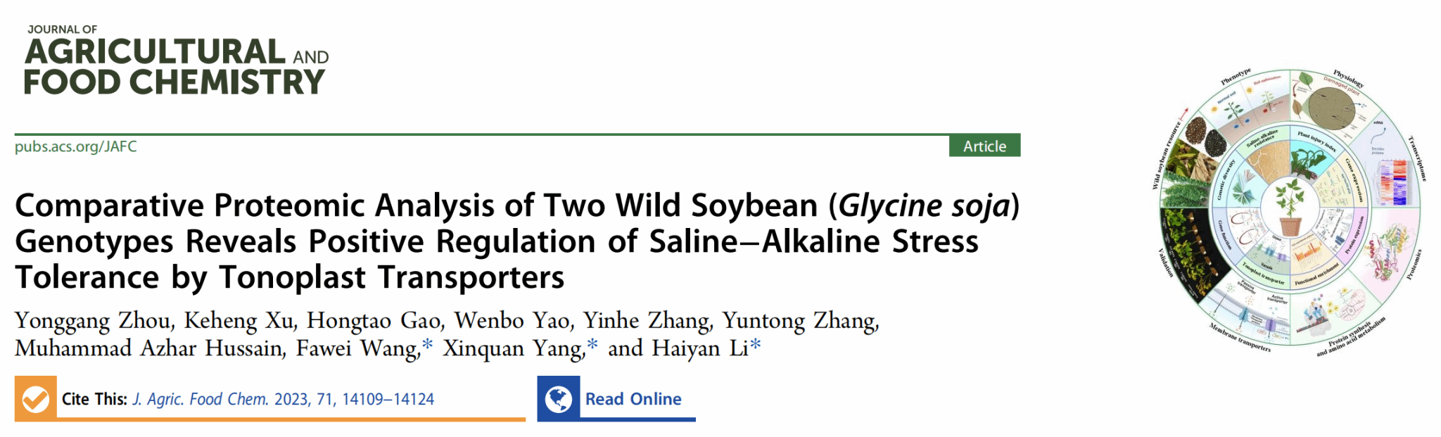2023年10月WilliamHill体育南繁学院李海燕教授团队在国际学术期刊Journal of Agricultural and Food Chemistry (中国科学院1区TOP,IF:6.1)上发表“Comparative proteomic analysis of two wild soybean (Glycine soja) genotypes reveals positive regulation of saline-alkaline stress tolerance by tonoplast transporters”的研究论文。该研究通过对125份不同地区来源的野生大豆盐碱耐受性的鉴定,并借助蛋白质组学分析的方法,分析发现氨基酸代谢、蛋白质合成和液泡膜转运蛋白形成了一个复杂的反馈网络,并影响大豆的盐碱胁迫耐受性。同时,重点研究了差异表达的液泡膜转运蛋白(GsTIP2-1、GsTIP2-2、GsINT1、GsSUC4和GsACA11)参与大豆耐盐碱调控的相关功能,以解析大豆在盐碱胁迫下的潜在分子调控机制。该项目的研究一方面为深入探索大豆盐碱耐受性的分子机制奠定基础;另一方面也为利用分子育种手段培育耐盐碱大豆新品系提供候选基因及新思路。