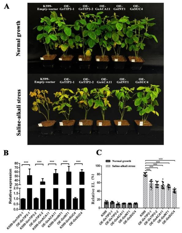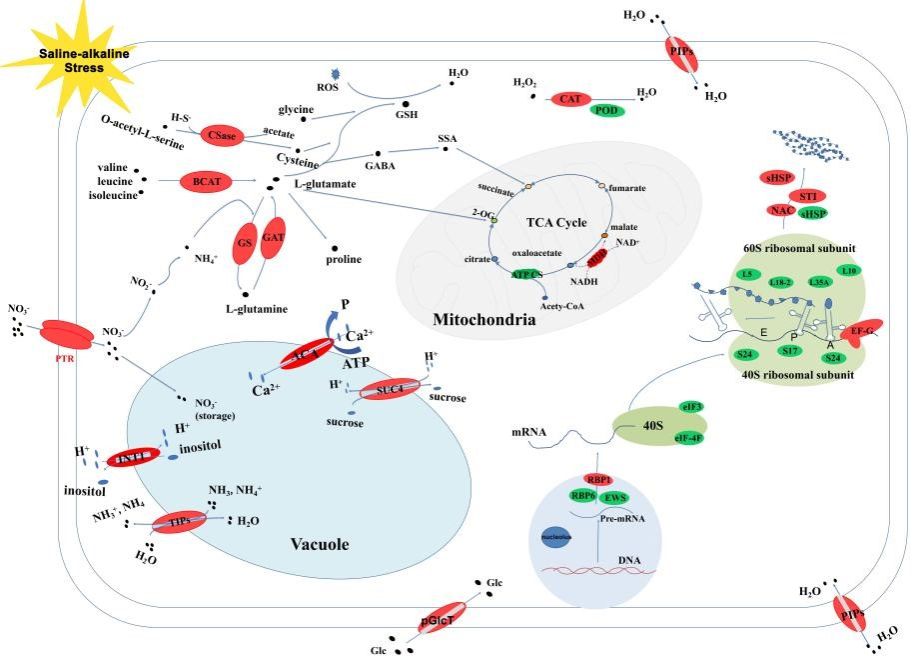 研究者为了鉴定5个液泡膜差异表达蛋白(GsTIP2-1、GsTIP2-2、GsINT1、GsSUC4和GsACA11)的功能,分别进行了酵母异源表达及大豆发状根诱导复合体植株等实验,证实了上述液泡膜转运蛋白可能通过减轻对蛋白质合成和氨基酸代谢的抑制,并发挥协同作用,从而提高大豆盐碱胁迫耐受性(图3)。