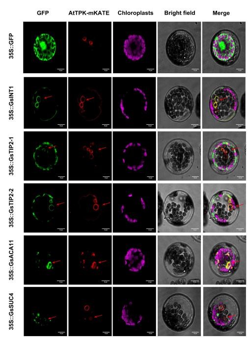 图2 液泡膜转运蛋白(GsINT1, GsTIP2-1, GsTIP2-2, GsACA11 and GsSUC4)亚细胞定位分析