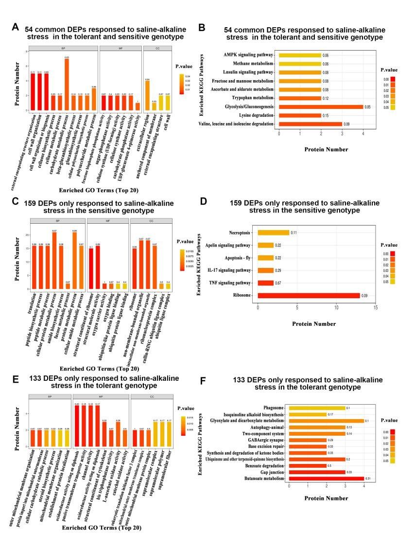 图1. 盐碱耐受和敏感型野生大豆盐碱特异性差异表达蛋白的功能富集分析