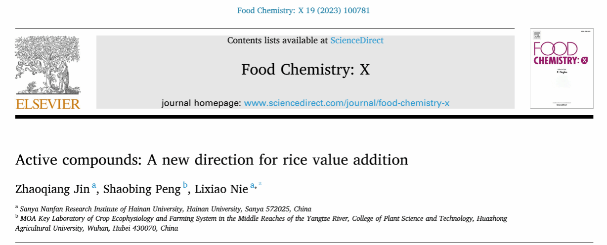 成果一:聂立孝教授受邀在本领域中国科学院一区TOP期刊《Food Chemistry: X》上发表了题为“Active compounds: A new direction for rice value addition”的综述论文(DOI:10.1016/j.fochx.2023.100781)。聂立孝教授为论文通讯作者,博士生金朝强为论文第一作者。