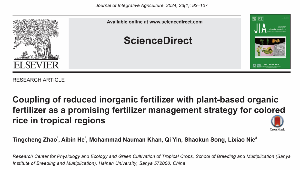 成果四:“Coupling of reduced inorganic fertilizer with plant-based organic fertilizer as a promising fertilizer management strategy for colored rice in tropical regions”,论文发表在本领域中国科学院一区TOP期刊《Journal of Integrative Agriculture》上(DOI:10.1016/j.jia.2023.04.035)。聂立孝教授为论文通讯作者,博士生赵廷丞为论文第一作者。