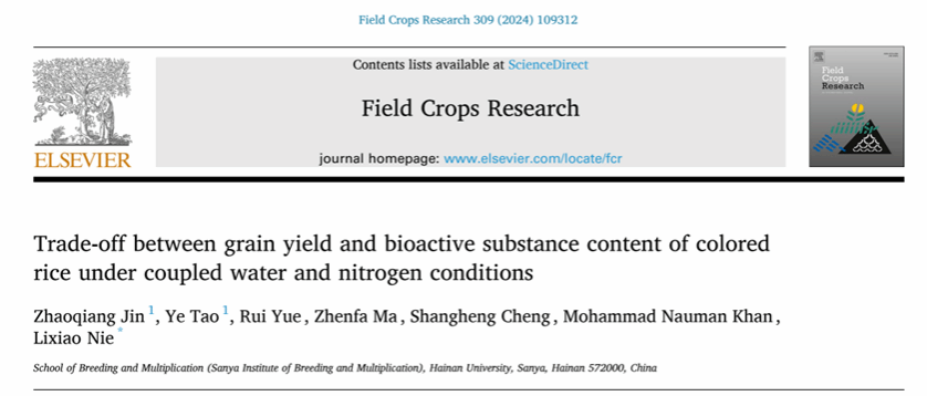 成果二:“Trade-off between grain yield and bioactive substance content of colored rice under coupled water and nitrogen conditions”,论文发表在本领域中国科学院一区TOP期刊《Field Crops Research》上(DOI:10.1016/j.fcr.2024.109312)。聂立孝教授为论文通讯作者,博士生金朝强和博士后陶冶为论文共同第一作者。