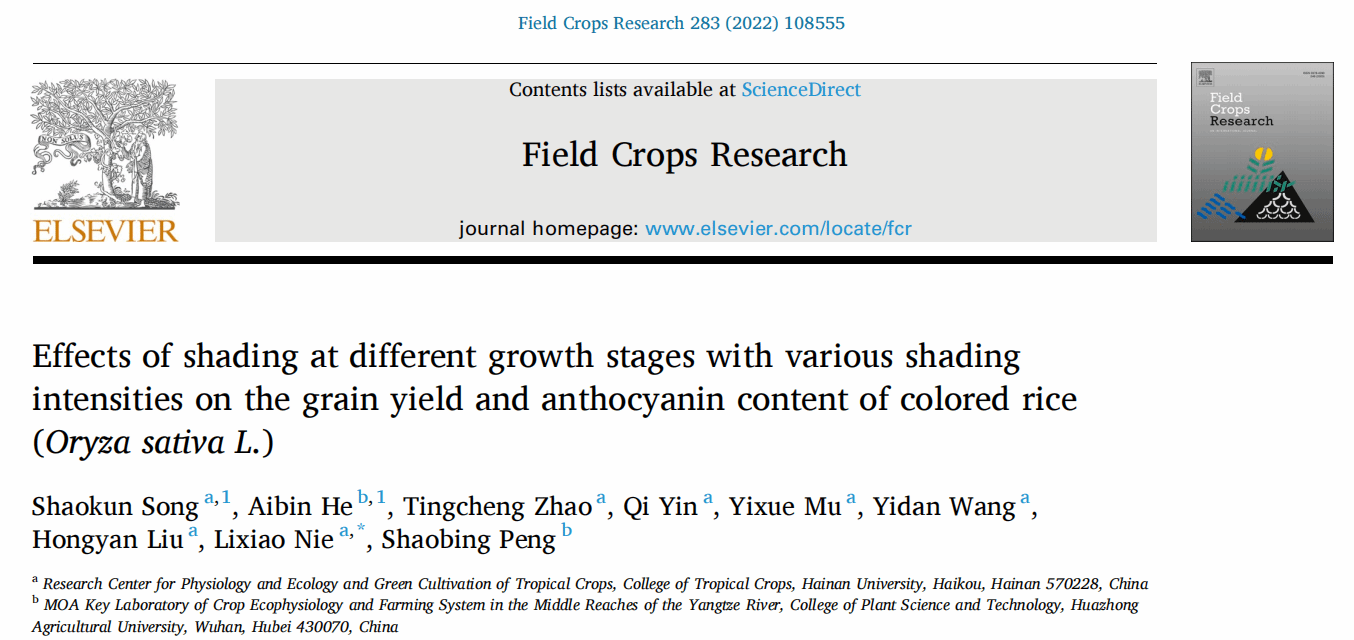 成果五:“Effects of shading at different growth stages with various shading intensities on the grain yield and anthocyanin content of colored rice (Oryza sativa L.)”,论文发表在本领域中国科学院一区TOP期刊《Field Crops Research》上(DOI:10.1016/j.fcr.2022.108555)。聂立孝教授为论文通讯作者,博士生宋少坤为论文第一作者。