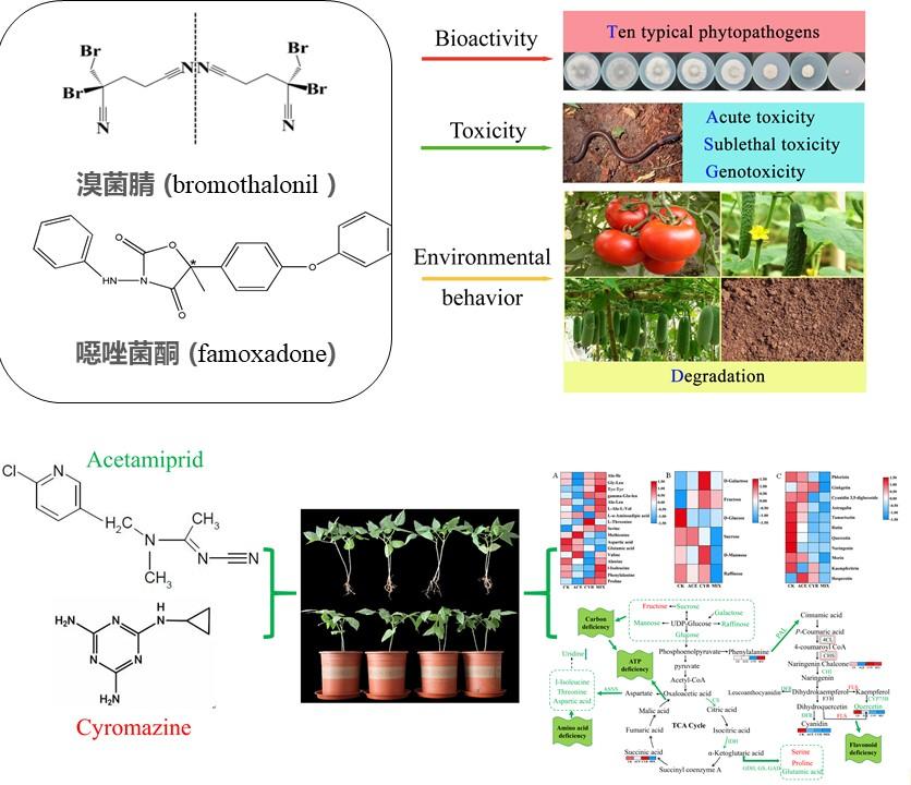 评估了溴菌腈、噁唑菌酮两种手性农药的立体选择性,两种药剂对靶标病原菌的毒力、对非靶标生物的毒性及在植物和土壤中的降解均存在差异。代谢组学和转录组学的方法探索了啶虫脒和灭蝇胺及其混合物对豇豆代谢的影响机制。啶虫脒显著影响氨基酸代谢,灭蝇胺和两种药剂的混合物影响糖代谢和类黄酮合成途径。