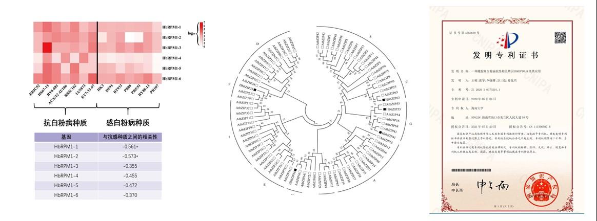 团队根据田间三年病害调查数据评价了由国家天然橡胶产业技术体系湛江实验站选育的192份橡胶树抗寒种质对白粉病和炭疽病的田间抗性水平。利用重病年数据鉴定出白粉病高抗品种24个、中抗品种9个,炭疽病抗性品种35个;通过隶属函数与聚类分析进一步对候选抗病种质进行排序和聚类,发现白粉病和炭疽病抗性排序靠前的种质均聚为一类,与其余种质区分显著,并初步筛选出抗白粉病和炭疽病优异种质各5份。鉴定了橡胶树HbbZIP、HbRPM、HbSGT1等抗白粉病相关基因家族成员的生物学功能。