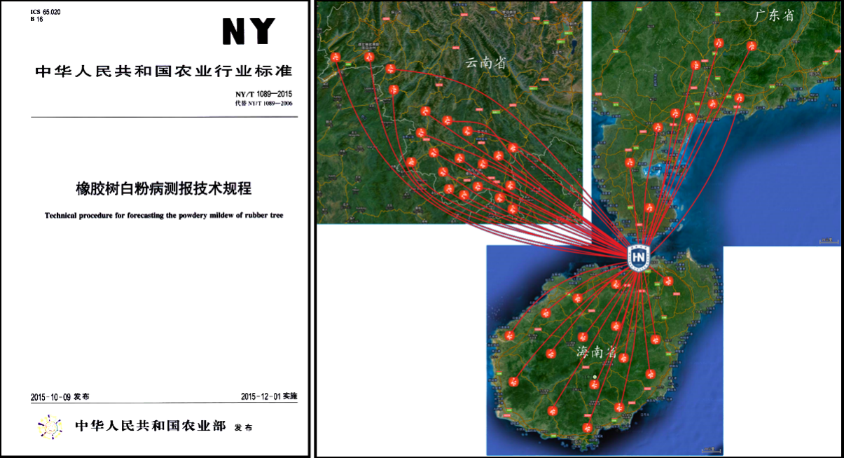 近十年内已在海南、云南、广东三省32个县市建立了52个监测站,132个固定观察点,覆盖橡胶种植面积1029.4万亩。制定了《橡胶树白粉病测报技术规程》,在我国橡胶主栽区建成了一套完整的橡胶树白粉病监测数据采集和报送网络,通过该专家系统的预测预报,准确把握施药时机,比盲目施药防治效果提高30%,减少用药40%。该监测网络同时监测及报送其它病虫害发生、发展情况,为病害防控提供基础支撑。
