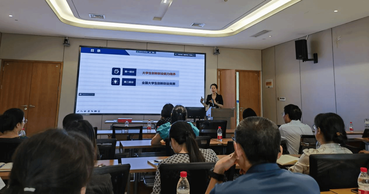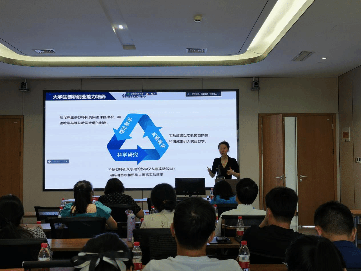 在为专任教师作的报告中,刘艳研究员主要从大学生创新创业能力培养、大学生创新创业竞赛两个方面结合自身经历进行了全面指导,讨论了当前高校教学、高等教育和就业存在的问题,提倡高校教师将创新创业教育贯穿人才培养的全过程,并从老师的角度分享了指导学生创新的主要经验:一把科研项目引入课堂,二将思政教育融入实验教学,三为学生创新创业教育搭建平台。在为学生作的报告中,刘老师重点讲解了大学生创新创业的重要性,讲述了创新性研究项目设计、研究条件准备以及研究报告撰写等重要的内容,鼓励学生通过参加各种比赛,积累经验和成果,提升自身的能力。此外,会后刘艳老师结合自己的指导经历对师生提出的问题一一做了解答。