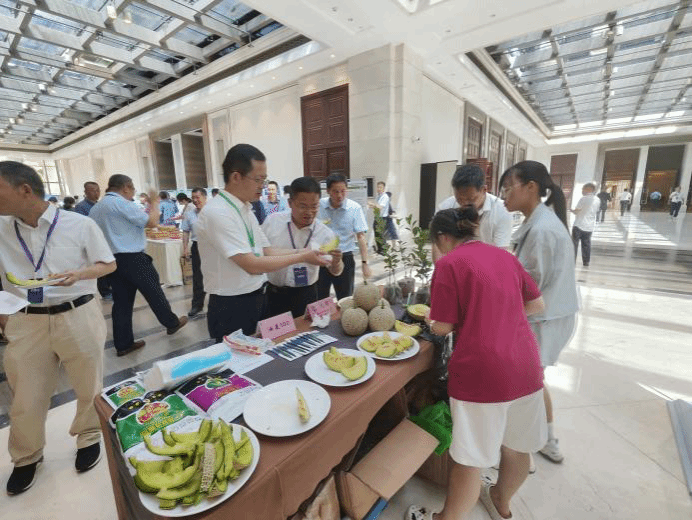 注:南繁学院杨小锋副院长向海南省农业农村厅副厅长孙法军介绍甜瓜新品种“久网”