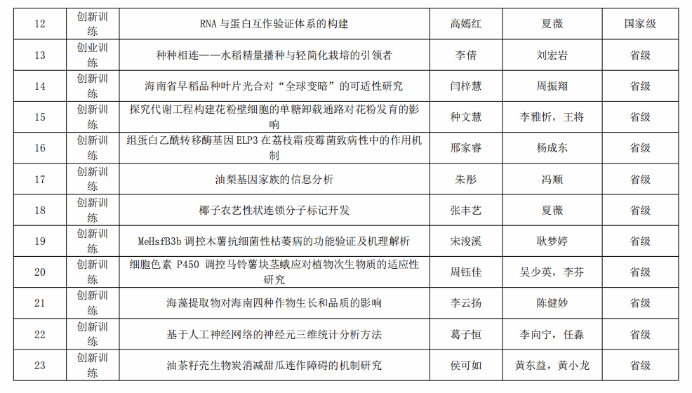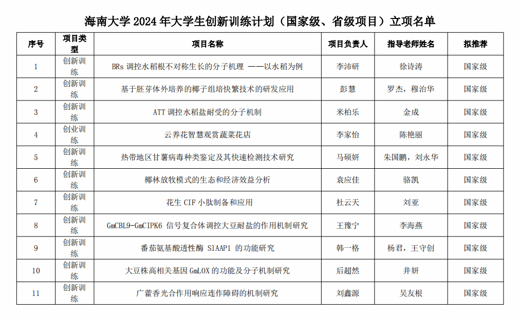 为进一步深化高校创新创业教育改革,将创新创业教育融入人才培养全过程,提高创新创业人才培养质量,WilliamHill体育举办了2024年“大学生创新创业训练计划”项目,经个人申报、教务处审核、实验教学中心组织专家评审,南繁学院师生的参赛作品在学校众多队伍中脱颖而出,7月12日我院共有23项项目立项,国家级项目共计12项,省级项目共计11项。