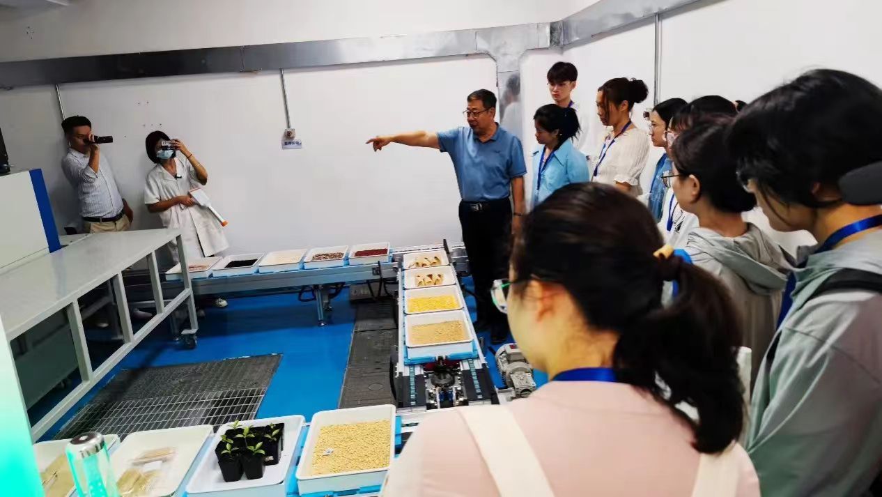 随后,营员们又参观了南繁学院的多个科研实验室。智慧育种平台利用大数据和人工智能技术精准育种;大豆无损3D根系表型分析平台通过三维扫描技术精准分析根系结构;电子加速器诱变育种实验室则利用物理诱变技术加速作物遗传改良进程……这些先进的科研设备和平台让营员们亲身感受到了南繁科技的前沿性和创新性。他们纷纷表示要将所学知识和技术应用到未来的科研实践中去推动南繁科技的进步和发展壮大。