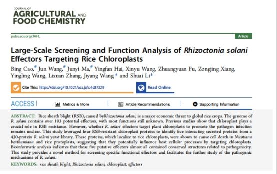 本站讯(通讯员 王永梅)近日,南繁学院2022级种子科学与工程专业学生马均懿在曹兵老师团队的悉心指导下以共同第一作者在中国科学院一区TOP期刊《Journal of Agricultural and Food Chemistry》上发表了题为“Large-scale screening and function analysis of Rhizoctonia solani effectors target rice chloroplast“的论文,揭示了纹枯病菌效应子通过靶向水稻叶绿体来影响寄主细胞过程的潜在机制。曹兵老师团队一直深入研究热带作物的抗病基因和分子机制,开发抗病品种,提升作物的抗病能力,减少病害损失,为保障粮食安全作出重要贡献。