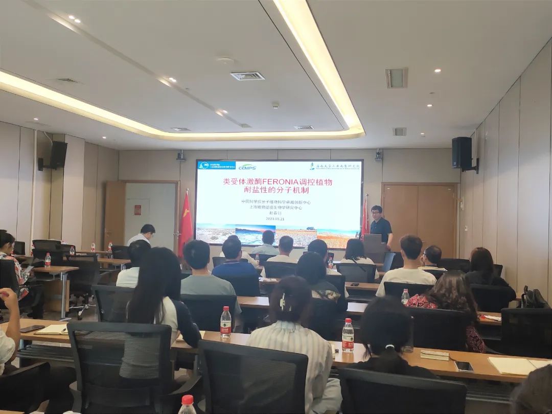 随后,赵春钊研究员重点介绍了LRXs-RALFs-FER模块在植物耐盐中的作用机制,揭示出光敏色素phyB基因突变可以抑制lrx345和fer-4突变体对盐胁迫敏感的表型。生化实验表明FER和phyB直接互作并且能够磷酸化phyB,而phyB磷酸化修饰可以调控phyB在细胞核中的暗逆转和在细胞核中的蛋白积累,阐明了FER通过调控phyB介导的光信号通路平衡植物生长和耐逆的分子机制。此外,还对相分离的概念和目前植物中相分离的相关研究进展进行了介绍,并深入浅出地讲述了相分离蛋白IDR1调控逆境胁迫下种子萌发的作用机理。